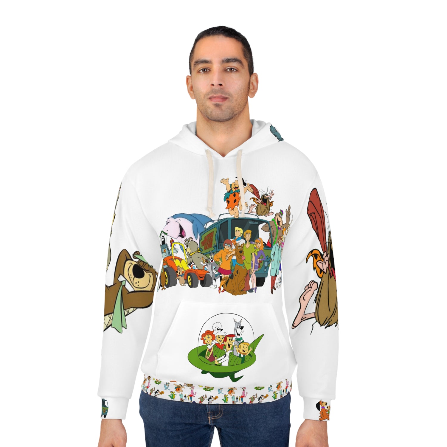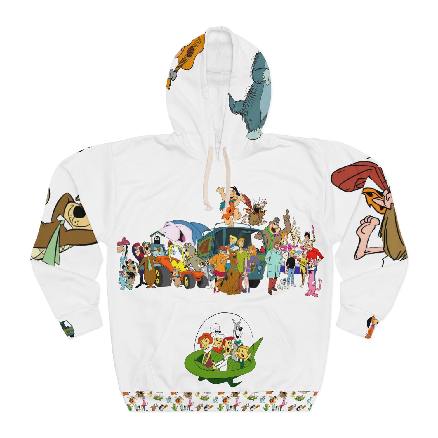This Pullover Hoodie is made for warmth and comfort. Made to be easily customizable without white lines at the seams, this all-over print pullover hoodie is waiting for you to add a great design and it instantly becomes fashionable. It features a large front pocket, a hood with a drawstring, and is custom cut and sewn.